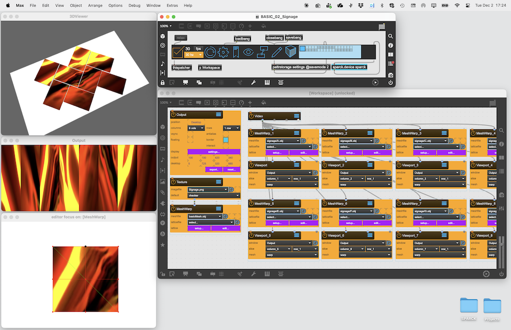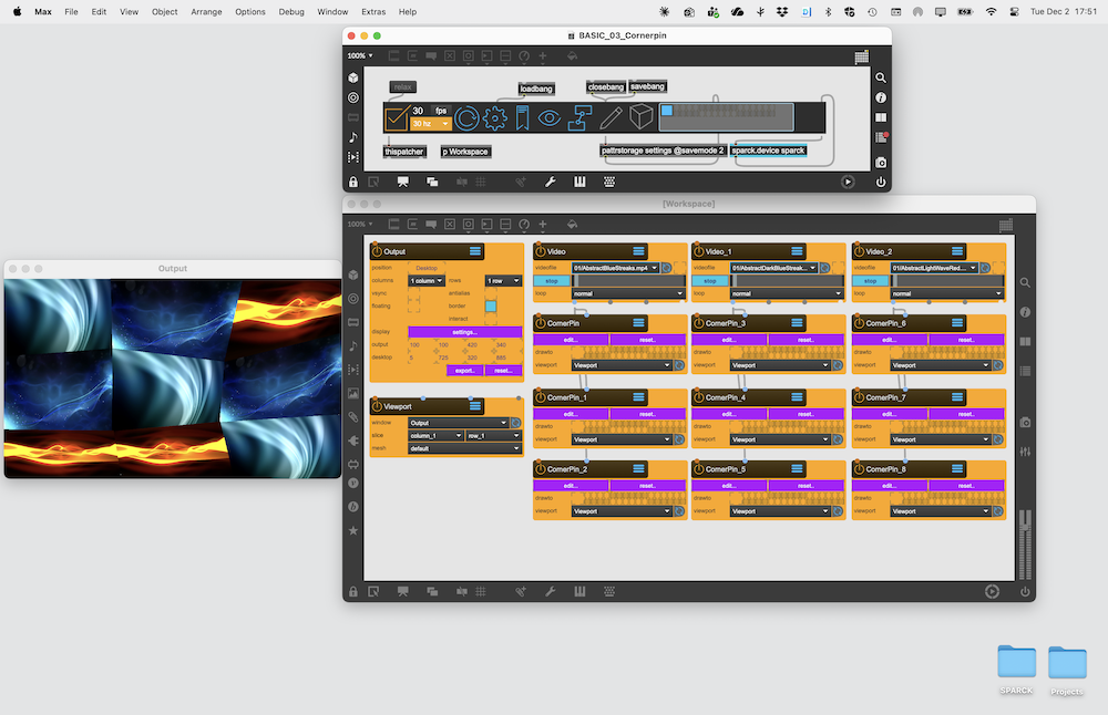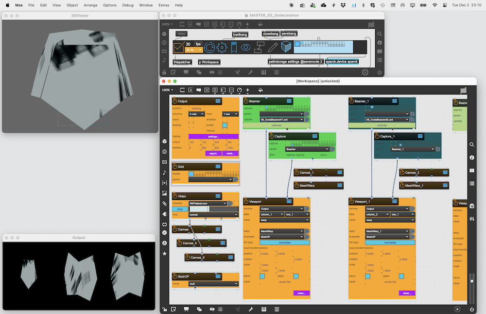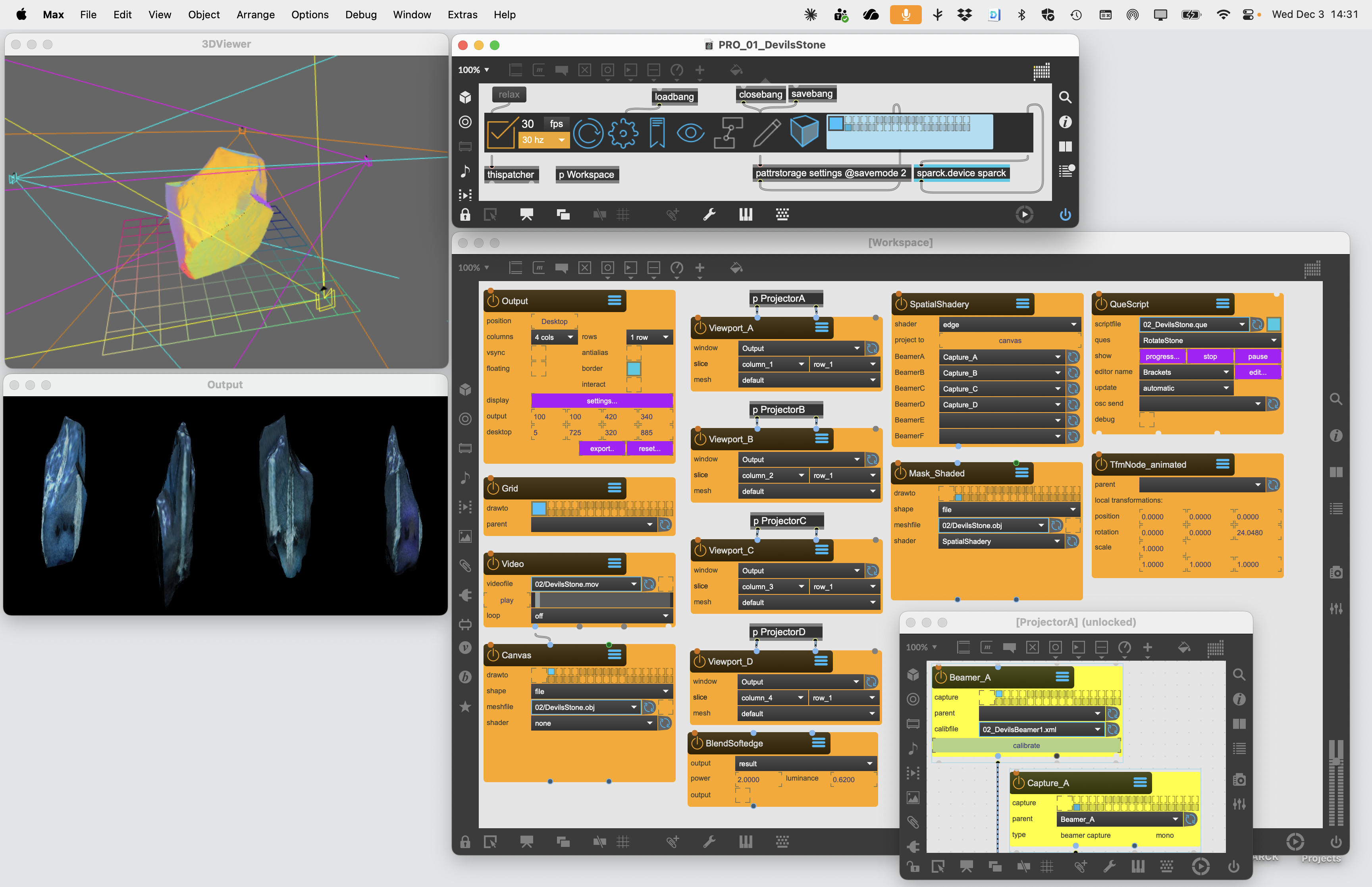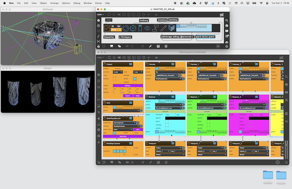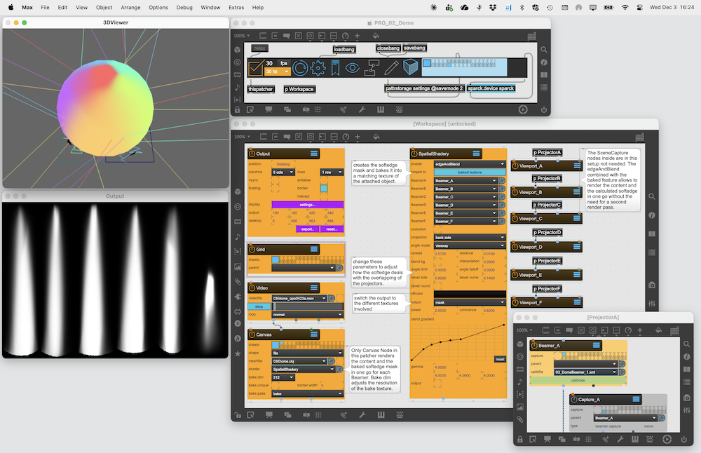 Using the Beamer Node to output four calibrated renderpasses to four different projectors by splitting an Window window into four Viewport. The content projected onto the screen is generated by a ShaderRaymarcher object. The BoxMapCamera is used to indicated the ray origin for the Shader.