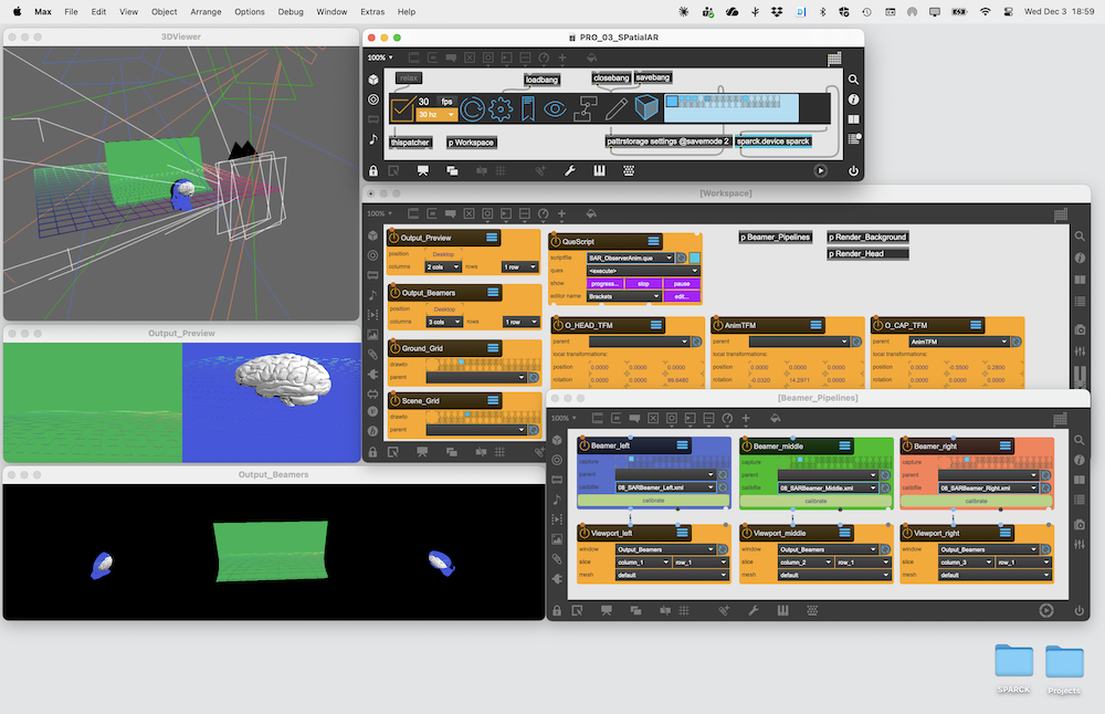 A Barebones Spatial Augmented Reality Setup. Three calibrated render pipelines play on three different projectors by splitting a Window into three Viewport. Each render pipeline uses a calibrated Beamer node. No SpatialShadery nodes are used in this setup to keep the patch simple. The content projected on the head Canvas is recorded in a primary render pass by a SceneCapture and then reprojected on the head from the same point with a TextureProjectury node. A similar setup is used for the background surface. The animations are played back a QueScript and multiple transformation trees and with a TfmLookAt node it is made sure that the SceneCamera always points at the correct place.